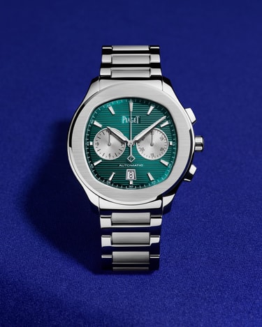 Discover the new 42mm Piaget Polo Chronograph watch with green dial and powerfully contrasting subdials. Created with the iconic round and cushion-shaped case signature of the collection, the watch features a 1160P automatic movement.